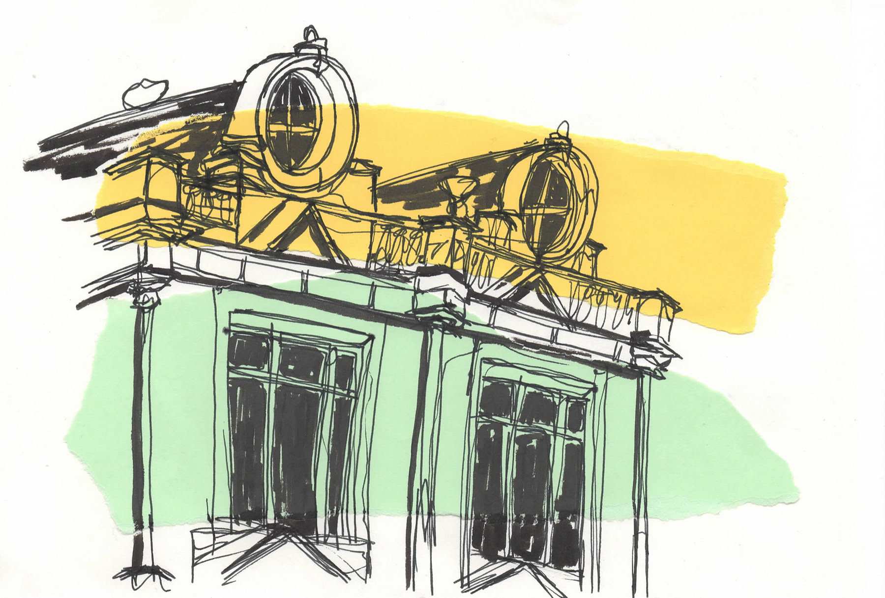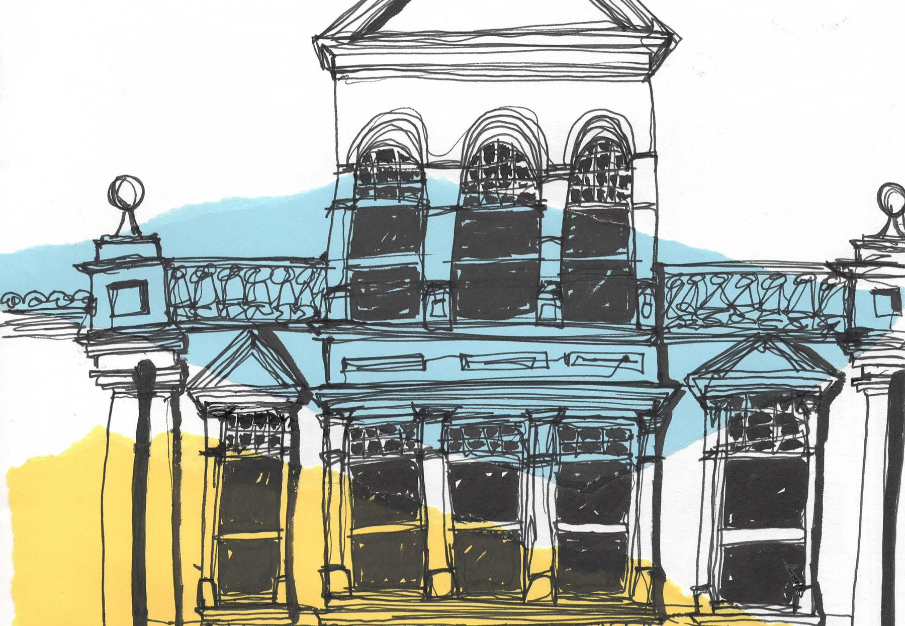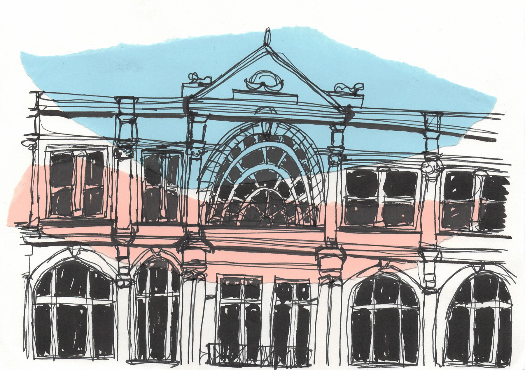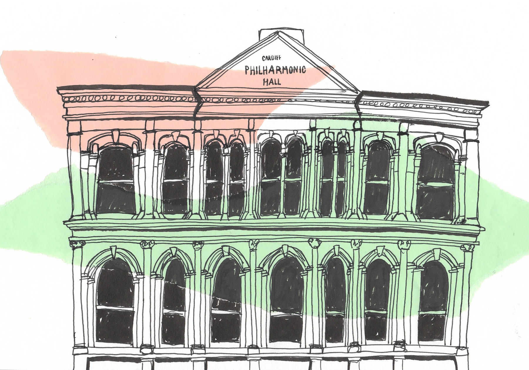 Urban sketches of buildings from Cardiff City Centre. Pen and collage.